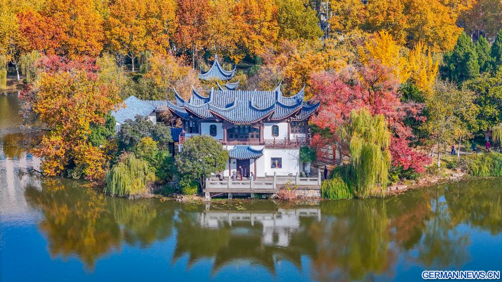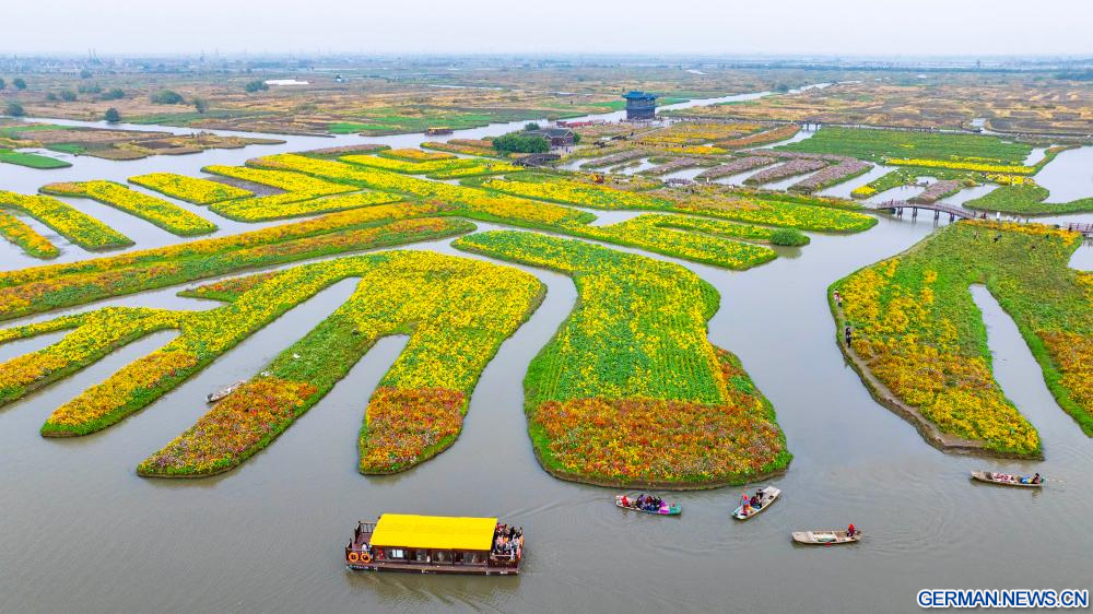 BEIJING, 10. November 2025 (Xinhuanet) -- Die Luftaufnahme einer Drohne zeigt Touristen, die an einem Landschaftsort in Xinghua in der ostchinesischen Provinz Jiangsu mit Booten fahren, 10. November 2025. (Foto von Zhou Shegen/Xinhua)