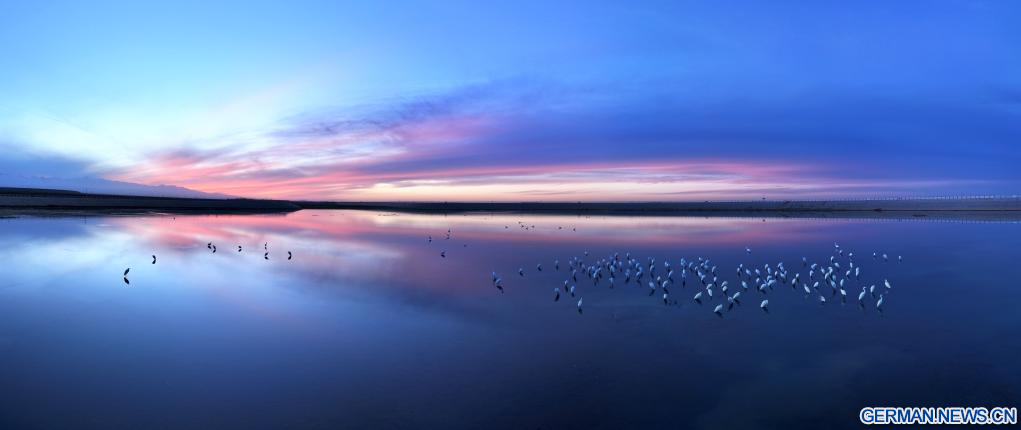 BEIJING, 10. November 2025 (Xinhuanet) -- Das Drohnenfoto zeigt Reiher bei der Suche nach Futter an einem Stausee im Kasachischen Autonomen Kreis Aksay in der nordwestchinesischen Provinz Gansu, 9. November 2025. (Foto von Gao Hongshan/Xinhua)