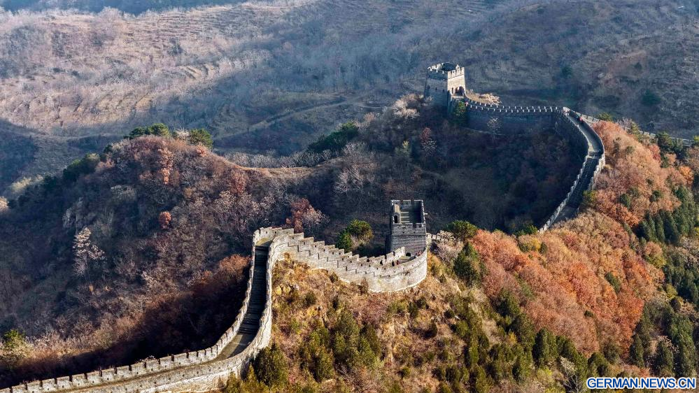 BEIJING, 10. November 2025 (Xinhuanet) -- Die Luftaufnahme einer Drohne zeigt die Landschaft des Huangyaguan-Abschnitts der Großen Mauer, der zwischen dem Bezirk Jizhou von Tianjin und dem Kreis Xinglong der Provinz Hebei in Nordchina liegt, 8. November 2025. (Foto von Liu Mancang/Xinhua)