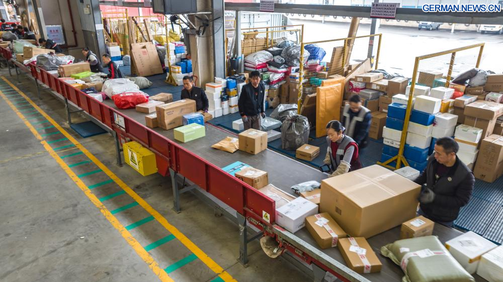 BEIJING, 10. November 2025 (Xinhuanet) -- Das Drohnenfoto vom 10. November 2025 zeigt Mitarbeiter an einer Paketsortierlinie eines Expressunternehmens in Anshun in der südwestchinesischen Provinz Guizhou. E-Commerce- und Logistikunternehmen in ganz China sind im Vorfeld des jährliches „Double Eleven“-Shopping-Festivals, das am 11. November stattfindet, mit dem Verkauf, der Verpackung und der Lieferung von Waren beschäftigt. (Foto von Chen Xi/Xinhua)