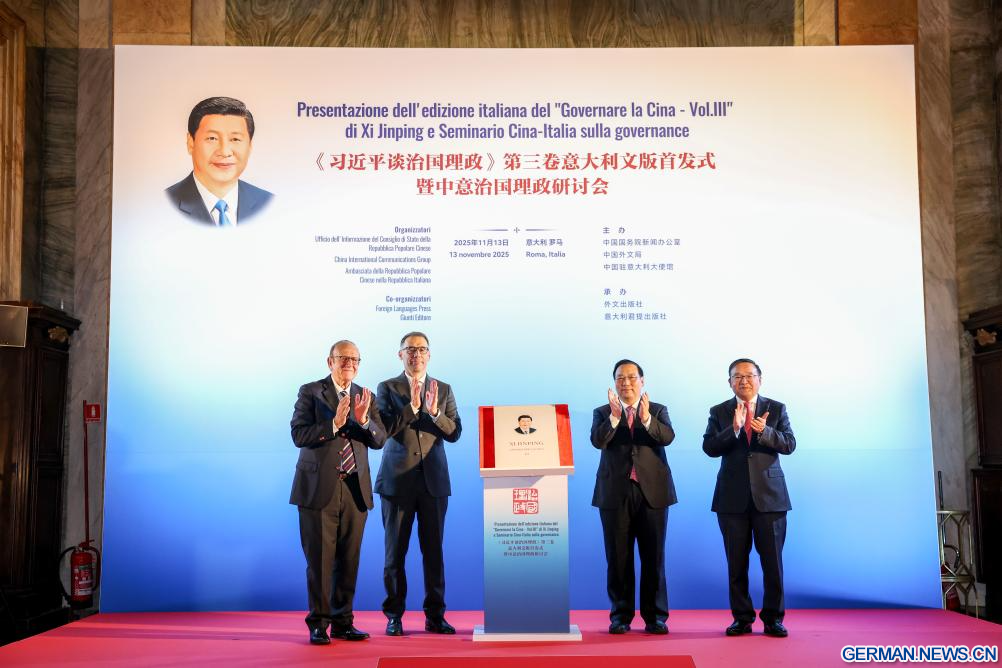 ROM, 14. November 2025 (Xinhuanet) -- Gäste enthüllen die italienische Ausgabe des dritten Bandes von „Xi Jinping: China regieren“ während der feierlichen Vorstellung in Rom, Italien, 13. November 2025. Die Veranstaltung zur Vorstellung der italienischen Ausgabe des dritten Bandes von „Xi Jinping: China regieren“ und das China-Italien-Symposium über Staatsführung fanden am Donnerstag hier statt, an dem etwa 150 Vertreter aus verschiedenen Bereichen beider Länder teilnahmen. (Quelle: Xinhua/Li Jing)