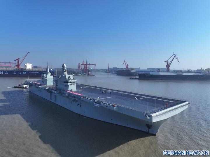 SHANGHAI, 14. November 2025 (Xinhua) -- Chinas erstes amphibisches Angriffsschiff vom Typ 076, das Schiff „Sichuan“ der Marine der chinesischen Volksbefreiungsarmee, läuft aus dem Hafen der Hudong-Zhonghua Shipbuilding (Group) Co., Ltd. in Shanghai in Ostchina aus, 14. November 2025.
