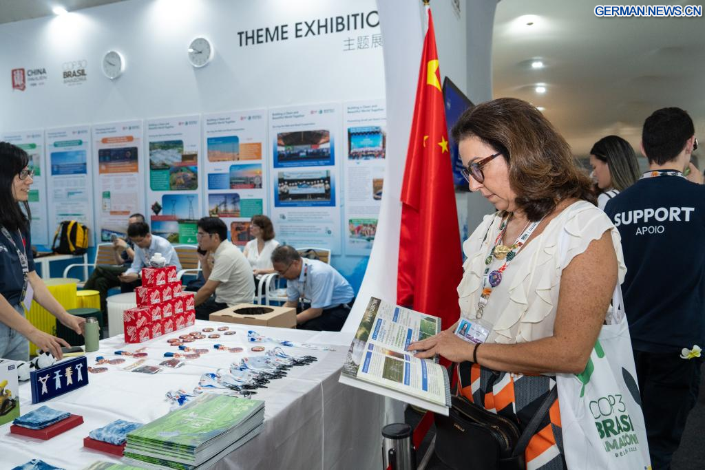 BELÉM, 15. November 2025 (Xinhuanet) -- Ein Gast präsentiert einen Faltfächer im China-Pavillon während der 30. Klimakonferenz der Vereinten Nationen in Belém, Brasilien, 12. November 2025. Die 30. Klimakonferenz der Vereinten Nationen, allgemein bekannt als COP30, wurde am Montag in Belém, Brasilien, eröffnet. Die Ausstellung chinesischer Kulturprodukte, grüner Technologien und Innovationen zog während der Konferenz die Aufmerksamkeit der Teilnehmer auf sich. (Quelle: Xinhua/Wang Tiancong)