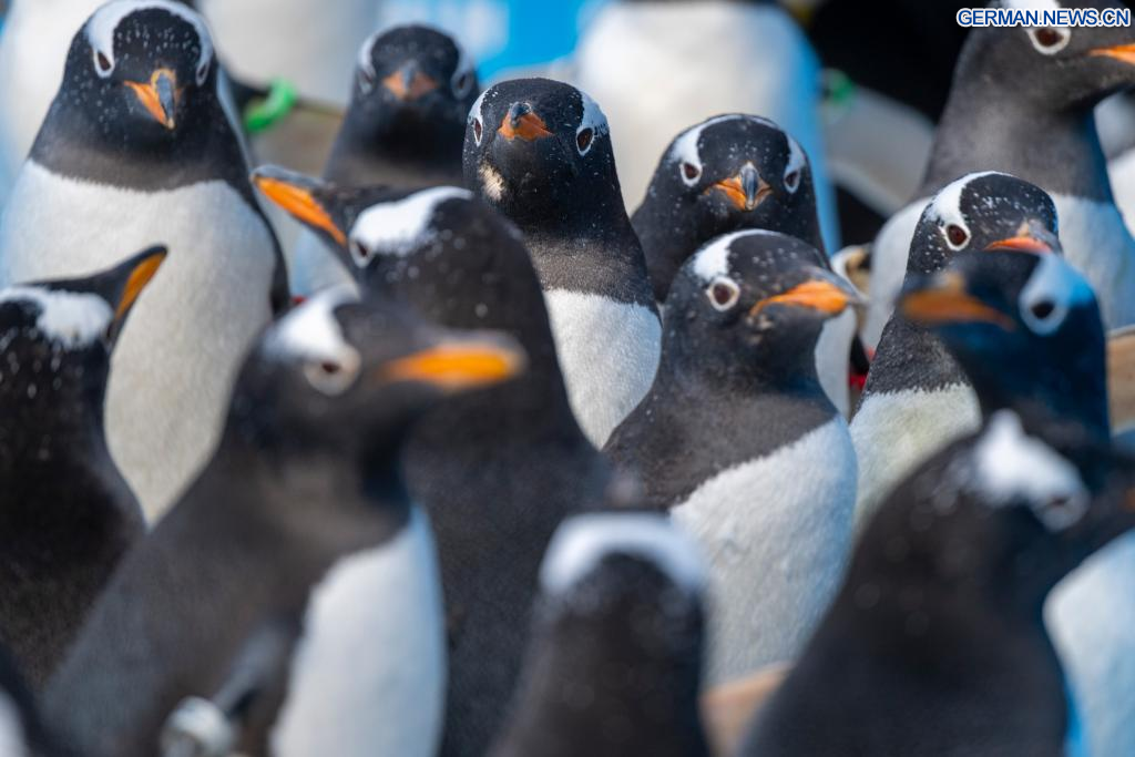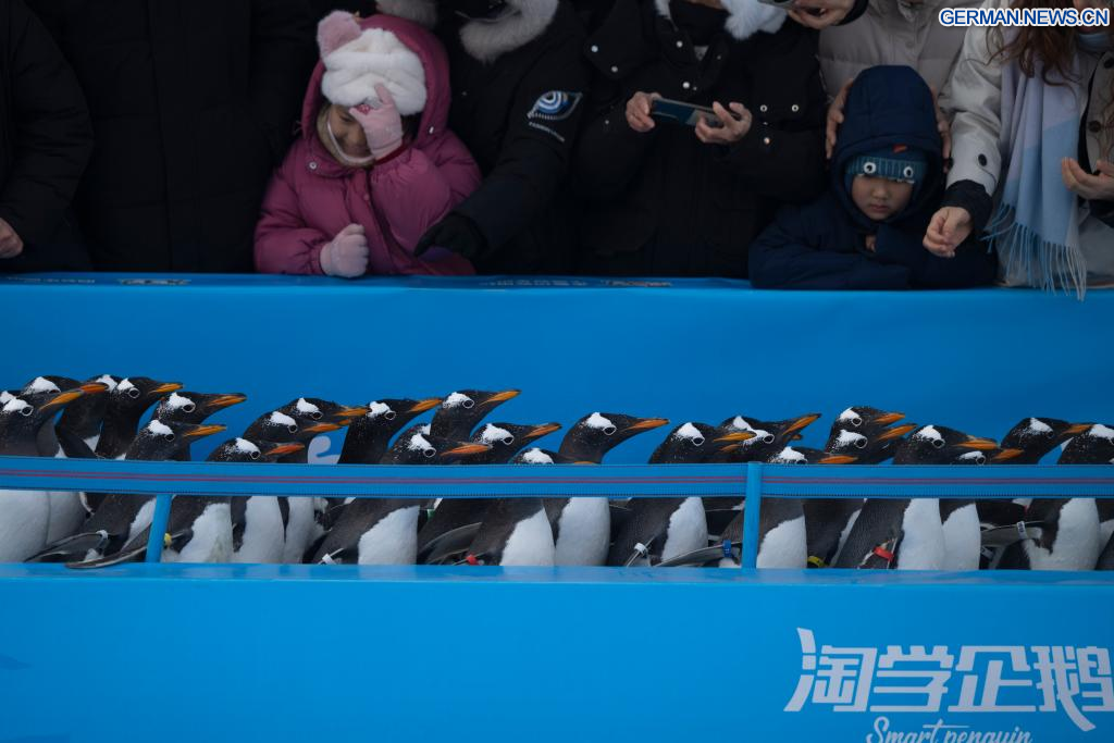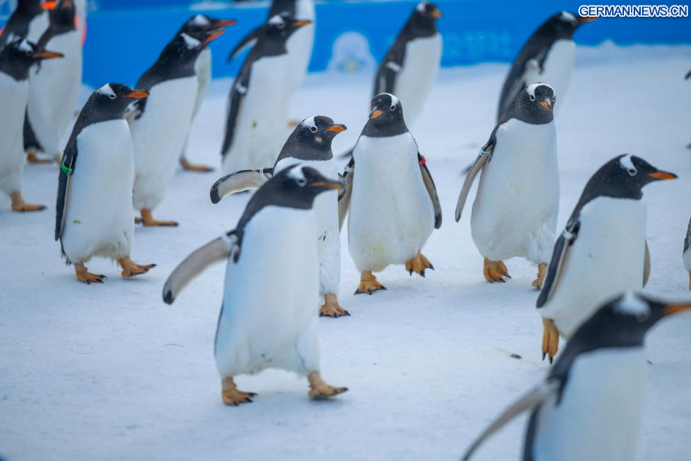 HARBIN, 13. Dezember 2025 (Xinhuanet) -- Pinguine sind während einer Pinguinparade im Harbin Polarland in Harbin, der Hauptstadt der nordostchinesischen Provinz Heilongjiang, zu sehen, 13. Dezember 2025. Das Harbin Polarland veranstaltete am Samstag eine Pinguinparade mit 100 antarktischen Pinguinen. (Quelle: Xinhua/Zhang Tao)