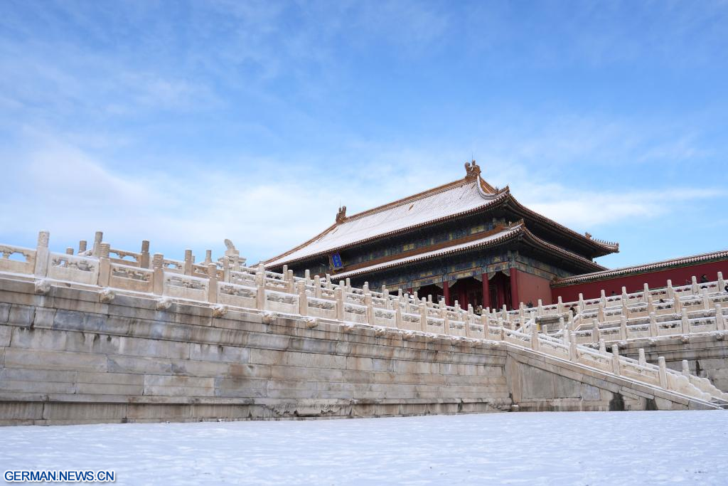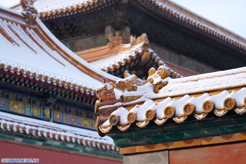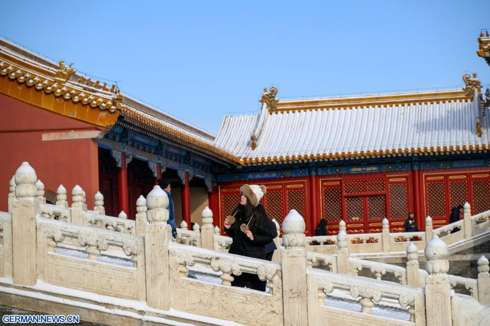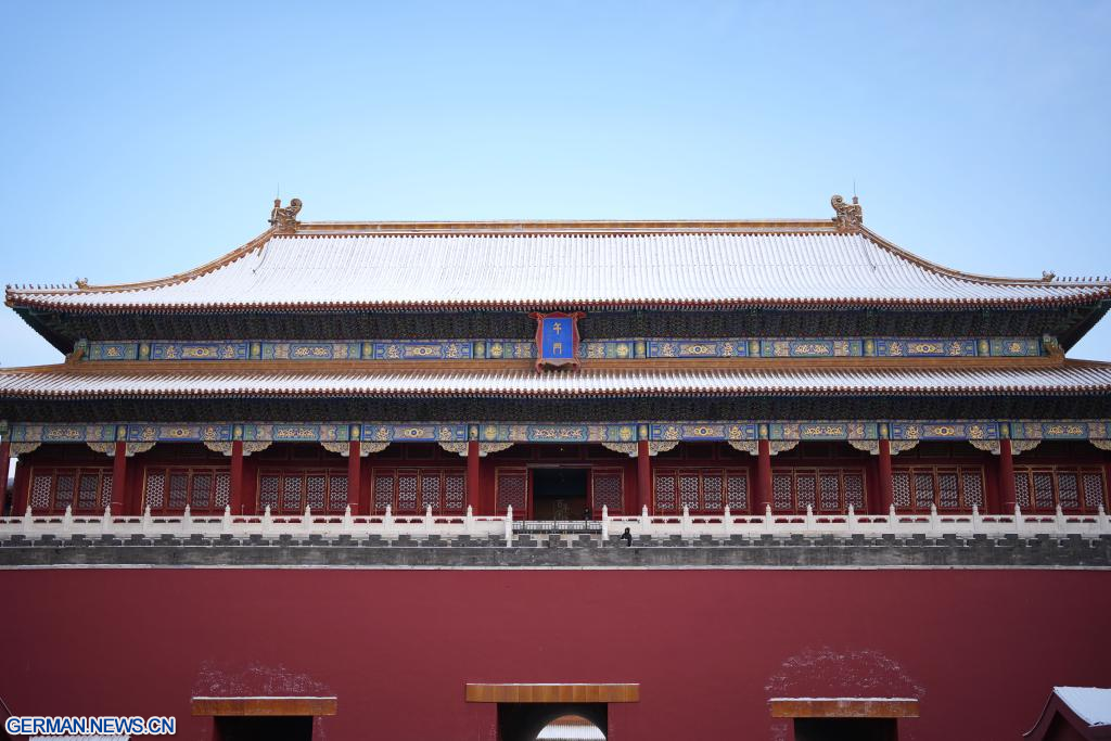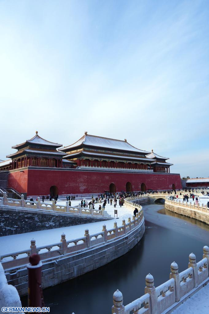 BEIJING, 13. Dezember 2025 (Xinhuanet) -- Touristen besuchen das Palastmuseum nach Schneefall in der chinesischen Hauptstadt Beijing, 13. Dezember 2025. (Quelle: Xinhua/Ma Xiaodong)