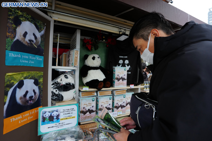 TOKIO, 21. Januar 2026 (Xinhua) -- Ein Besucher betrachtet Souvenirs von den Riesenpandas Xiao Xiao und Lei Lei im Ueno-Zoo im japanischen Tokio, 25. Dezember 2025. Die Riesenpandas Xiao Xiao und Lei Lei, die derzeit in einem Zoo in Tokio leben, werden am 27. Januar nach China zurückkehren. Damit wird es zum ersten Mal seit etwa einem halben Jahrhundert keine Pandas mehr in Japan geben, wie lokale Medien berichteten. (Xinhua/Jia Haocheng)