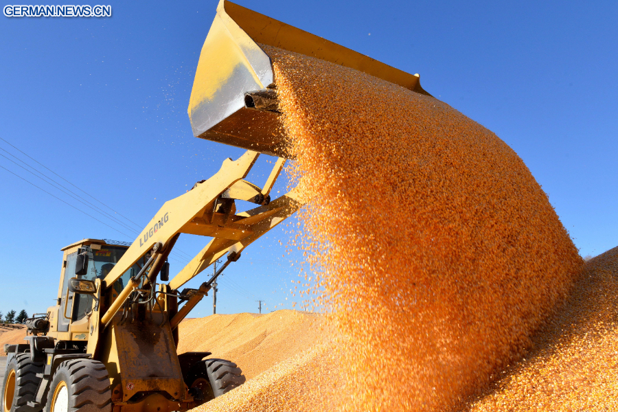 Das Foto zeigt einen Schaufellader beim Verladen getrockneter Maiskörner in einer Fabrik eines Landwirtschaftsunternehmens der Beidahuang-Gruppe in der Provinz Heilongjiang im Nordosten Chinas, 23. Oktober 2025. (Foto von Lu Wenxiang/Xinhua)