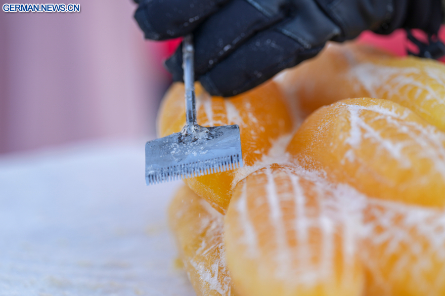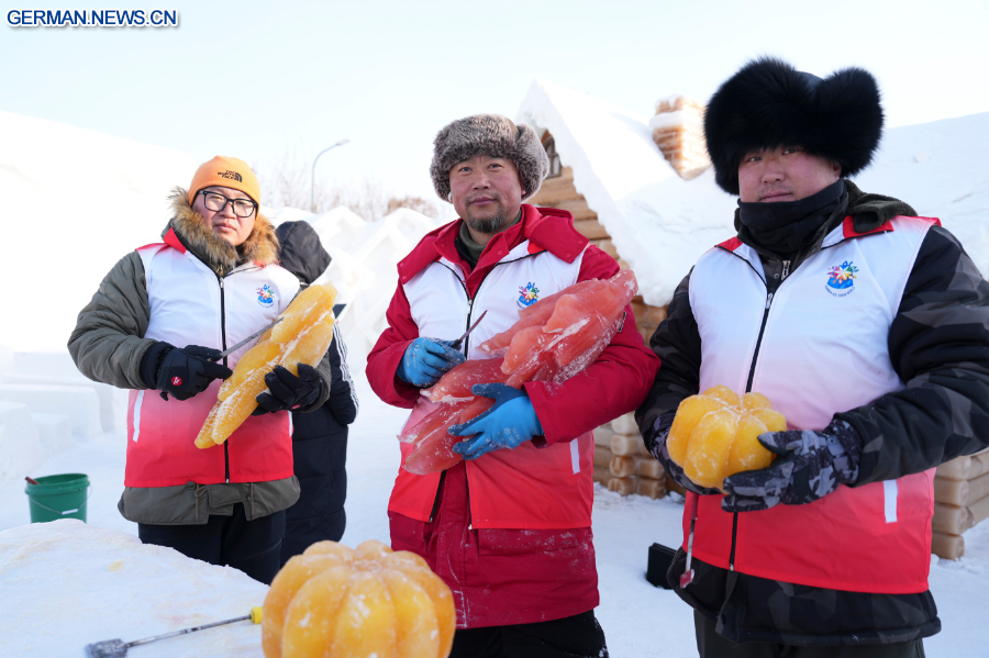 HARBIN, 29. Januar 2026 (Xinhua) -- Skulpturenkünstler präsentieren pflanzengefärbte Eisskulpturen in der Eis- und Schneewelt von Harbin in der Provinz Heilongjiang im Nordosten Chinas, 28. Januar 2026. Durch die Verwendung von pflanzengefärbtem Eis für ihre Schnitzereien haben die Eisskulpturenkünstler der diesjährigen Eis- und Schneewelt von Harbin ein neues visuelles Erlebnis in die Kunst des Eisschnitzens gebracht.