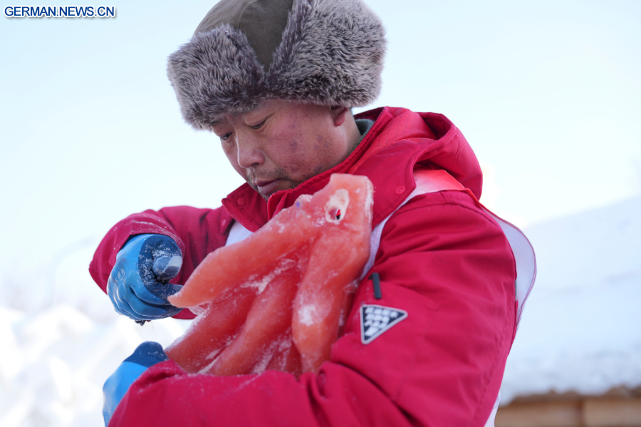 HARBIN, 29. Januar 2026 (Xinhua) -- Ein Eisskulpturenkünstler schnitzt eine pflanzengefärbte Eisskulptur in der Eis- und Schneewelt von Harbin in der Provinz Heilongjiang im Nordosten Chinas, 28. Januar 2026. Durch die Verwendung von pflanzengefärbtem Eis für ihre Schnitzereien haben die Eisskulpturenkünstler der diesjährigen Eis- und Schneewelt von Harbin ein neues visuelles Erlebnis in die Kunst des Eisschnitzens gebracht.