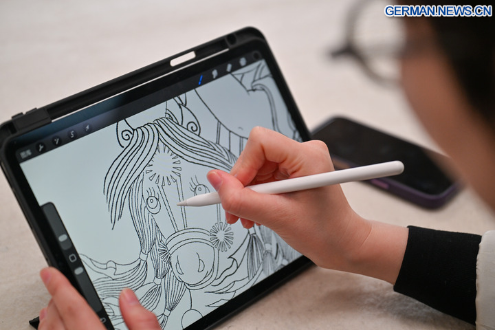 TIANJIN, 6. Februar 2026 (Xinhua) -- Wang Yan, eine Erbin der Yangliuqing-Neujahrsbilder, zeichnet den Entwurf für ein Neujahrsbild mit Pferdemotiv in der Tianjin Yangliuqing Fine Arts Press in Tianjin in Nordchina, 4. Februar 2026. Zur Feier des bevorstehenden Jahres des Pferdes veröffentlichte die Tianjin Yangliuqing Fine Arts Press eine Reihe von Neujahrsbildern mit Pferdemotiven, die traditionelle Neujahrsmaltechniken mit modernem Design verbinden. (Xinhua/Sun Fanyue)