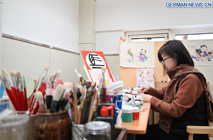 TIANJIN, 6. Februar 2026 (Xinhua) -- Eine Künstlerin mischt Farben für Neujahrsbilder in der Tianjin Yangliuqing Fine Arts Press in Tianjin in Nordchina, 4. Februar 2026. Zur Feier des bevorstehenden Jahres des Pferdes veröffentlichte die Tianjin Yangliuqing Fine Arts Press eine Reihe von Neujahrsbildern mit Pferdemotiven, die traditionelle Neujahrsmaltechniken mit modernem Design verbinden. (Xinhua/Sun Fanyue)