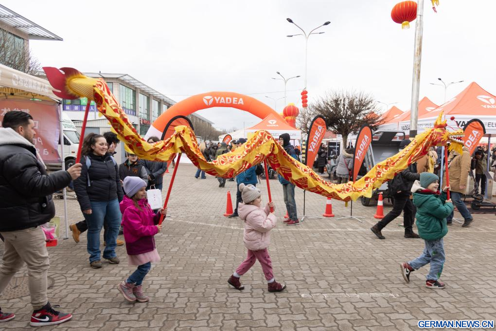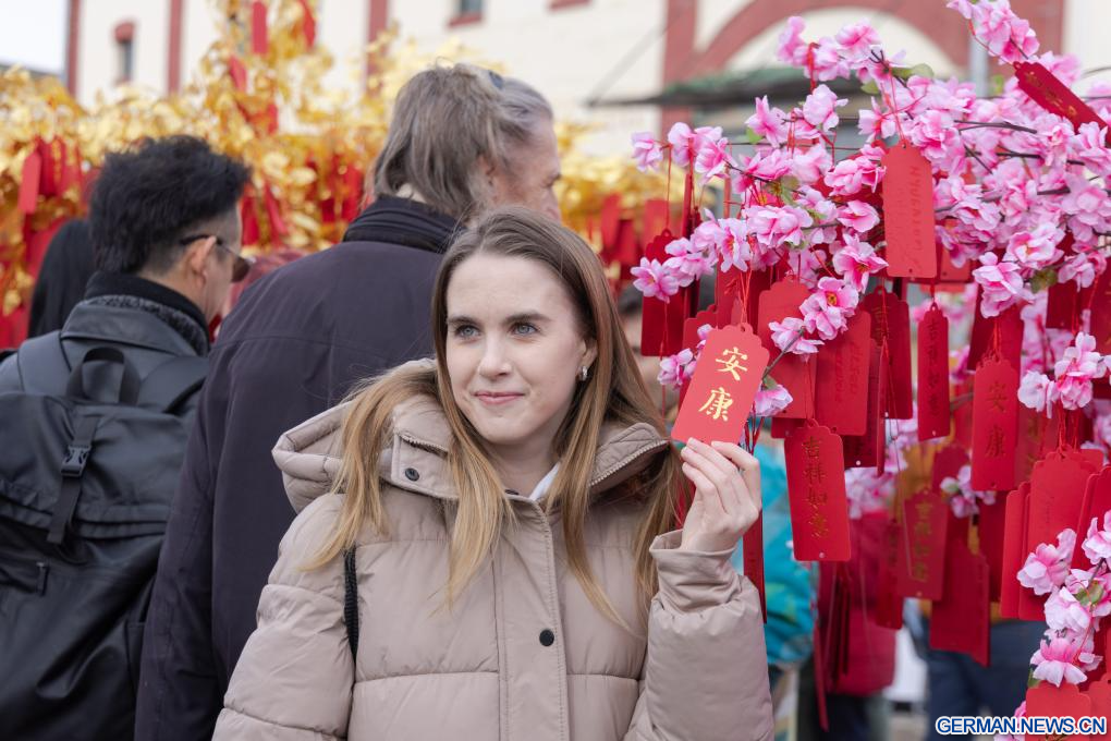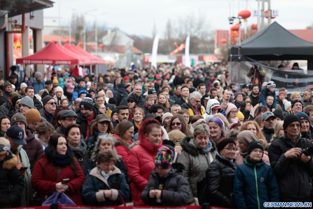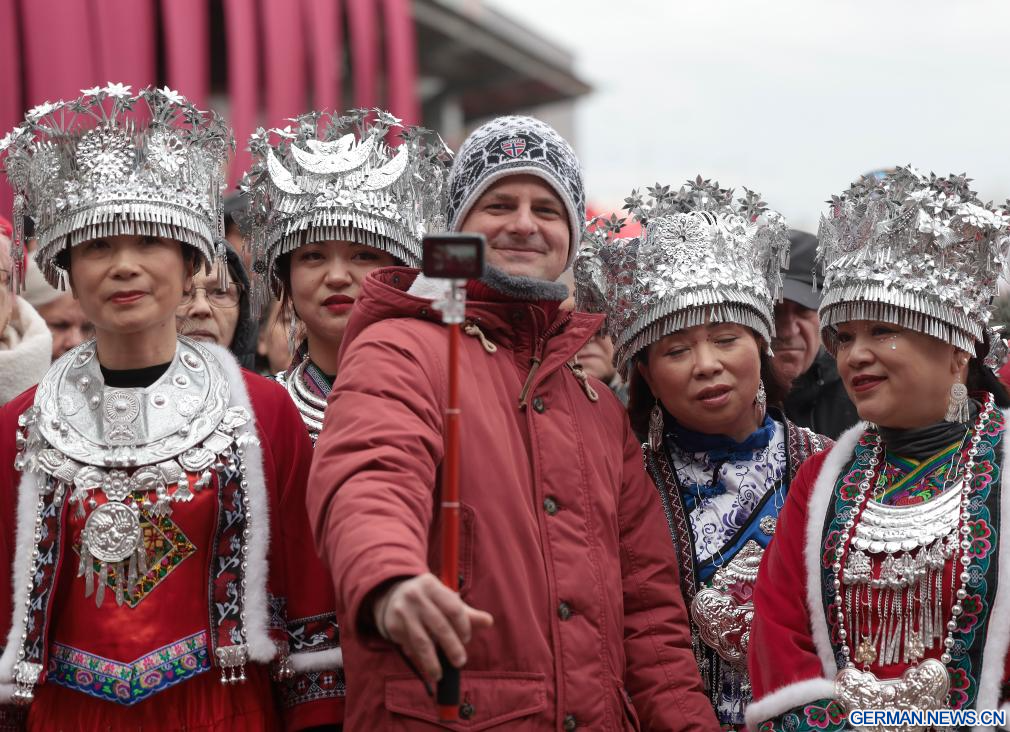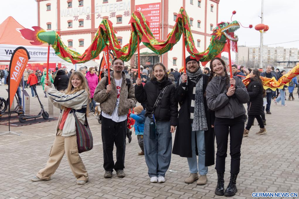 BUDAPEST, 8. Februar 2026 (Xinhuanet) -- Ein Mann macht ein Selfie mit Darstellerinnen in traditionellen Kostümen während des Tempelfestes zum Frühlingsfest in Budapests Chinatown in Budapest, Ungarn, 7. Februar 2026. (Foto von Laszlo Balogh/Xinhua)