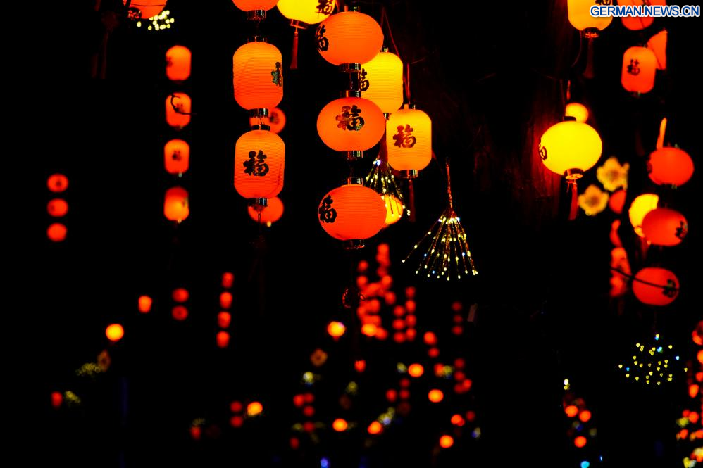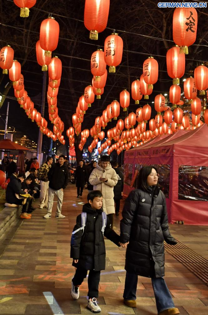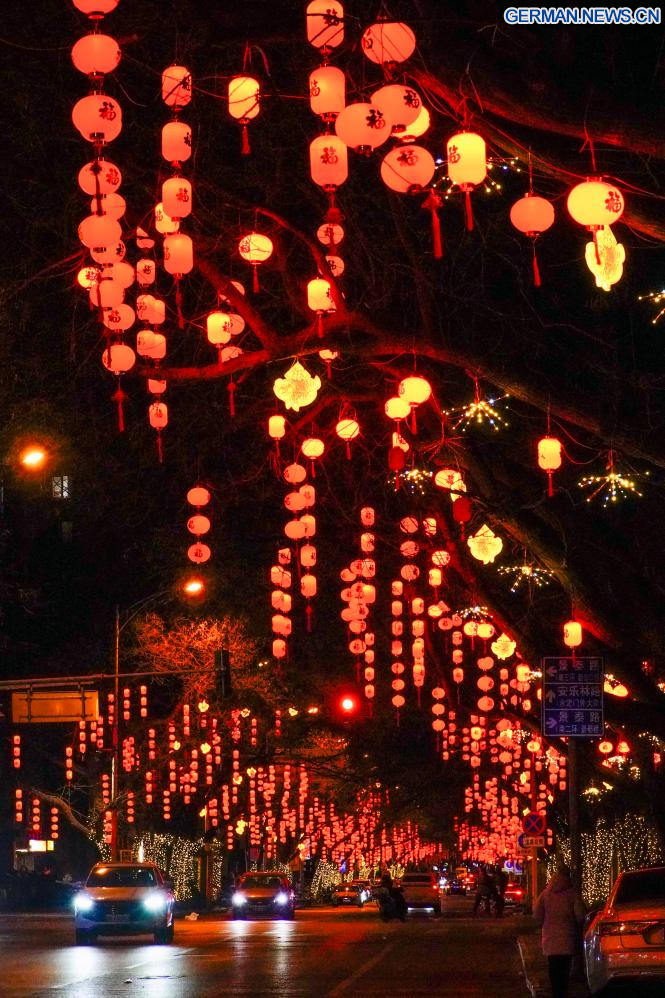 BEIJING, 8. Februar 2026 (Xinhuanet) -- Das am 7. Februar 2026 aufgenommene Foto zeigt Laternen, die zur Feier des Frühlingsfestes in Chinas Hauptstadt Beijing aufgehängt wurden. (Foto von Liu Mancang/Xinhua)