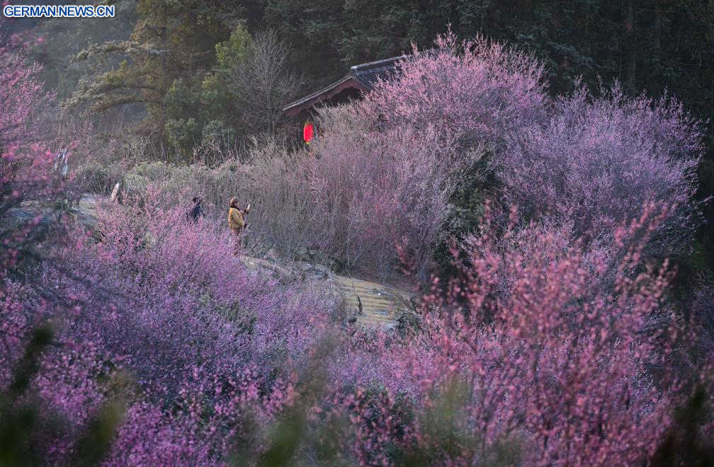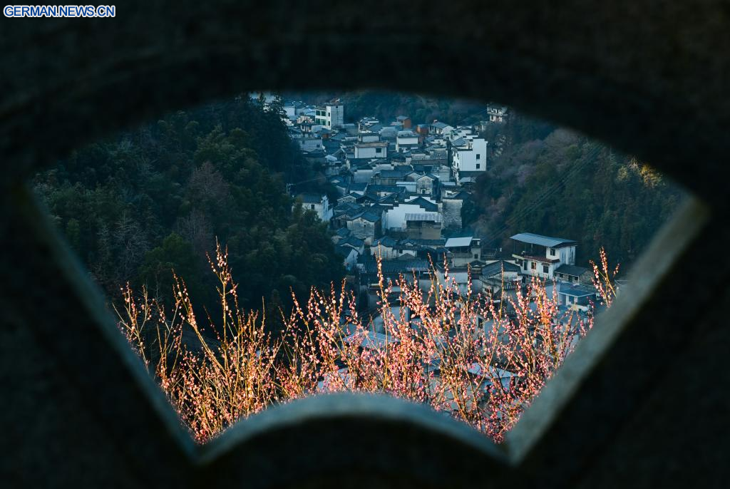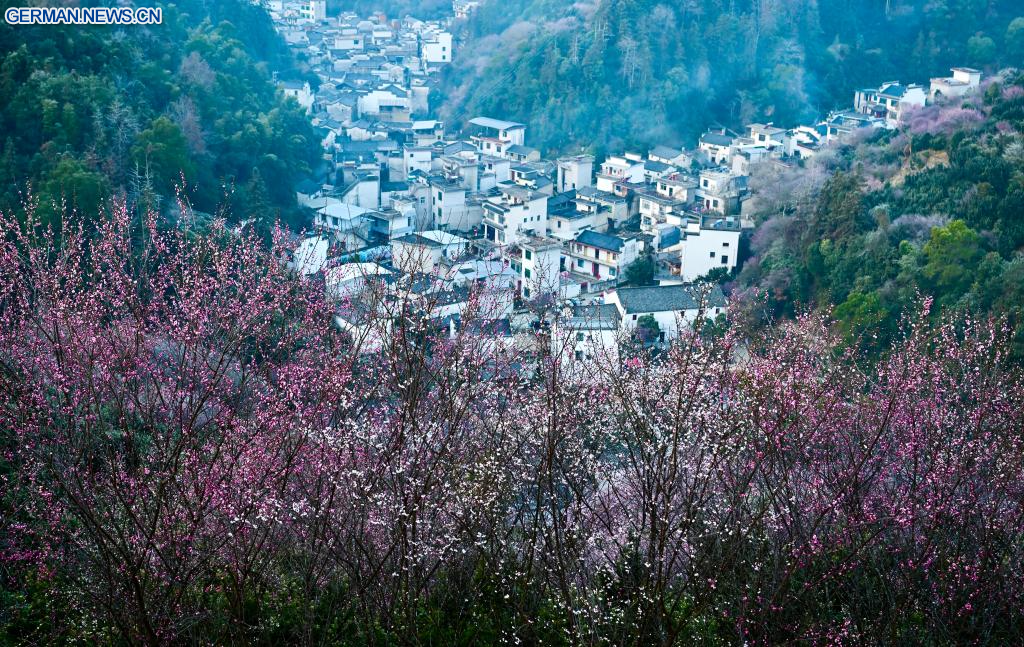 HUANGSHAN, 9. Februar 2026 (Xinhuanet) -- Die Luftaufnahme einer Drohne vom 9. Februar 2026 zeigt die Pflaumenblüten im Dorf Maihuayu im Kreis Shexian in der ostchinesischen Provinz Anhui. (Foto von Fan Chengzhu/Xinhua)
