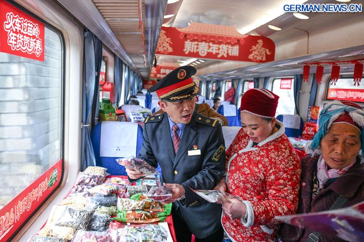 KAILI, 10. Februar 2026 (Xinhua) -- Schaffner Hu Guichuan (links) zeigt den Fahrgästen Produkte zum Neujahr im Zug Nr. 5640 in der Provinz Guizhou im Südwesten Chinas, 8. Februar 2026. Der Zug Nr. 5640 verkehrt in der Provinz Guizhou zwischen dem Autonomen Kreis Yuping der Dong in der Stadt Tongren und der Provinzhauptstadt Guiyang. Er verbindet mehr als 100 Dörfer ethnischer Minderheiten entlang der Strecke und macht das Reisen für die Dorfbewohner bequemer.