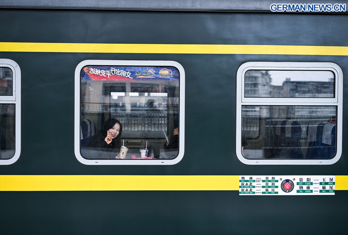 KAILI, 10. Februar 2026 (Xinhua) -- Das Foto zeigt eine Passagierin im Zug Nr. 5640 in der Provinz Guizhou im Südwesten Chinas, 8. Februar 2026. Der Zug Nr. 5640 verkehrt in der Provinz Guizhou zwischen dem Autonomen Kreis Yuping der Dong in der Stadt Tongren und der Provinzhauptstadt Guiyang. Er verbindet mehr als 100 Dörfer ethnischer Minderheiten entlang der Strecke und macht das Reisen für die Dorfbewohner bequemer.