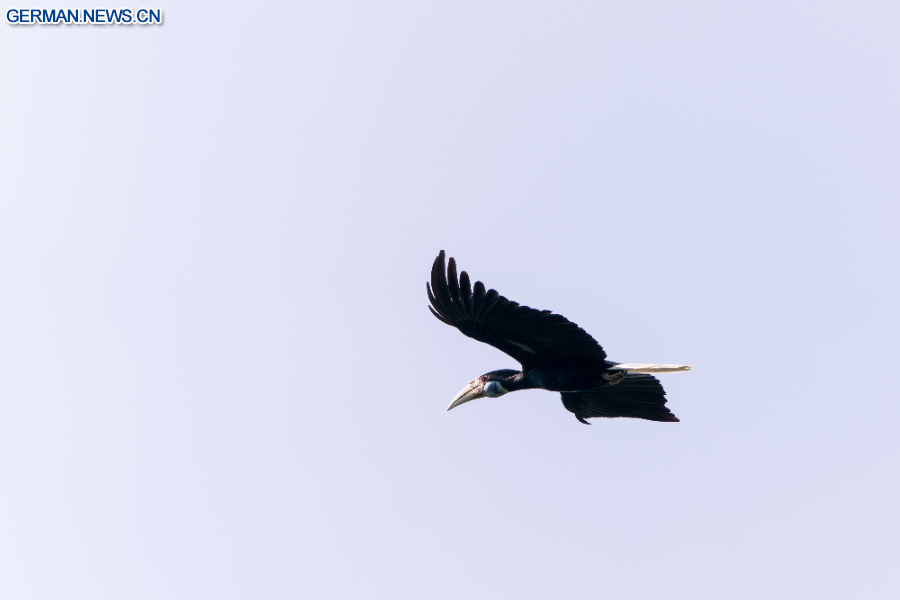 YINGJIANG, 11. Februar 2026 (Xinhua) -- Ein Nashornvogel fliegt über das Dorf Shiti im Kreis Yingjiang in der Provinz Yunnan im Südwesten Chinas, 7. Februar 2026. Im Provinz-Naturschutzgebiet Yunnan Tongbiguan befinden sich Nashornvögel, eine in China unter staatlichem Schutz der höchsten Kategorie stehende Art, in einer kritischen Phase der Brutvorbereitung. Mitglieder des „Nashornvogel-Patrouillenteams” führen regelmäßige Patrouillen durch, um die Sicherheit der Vögel während der Brutzeit zu gewährleisten.