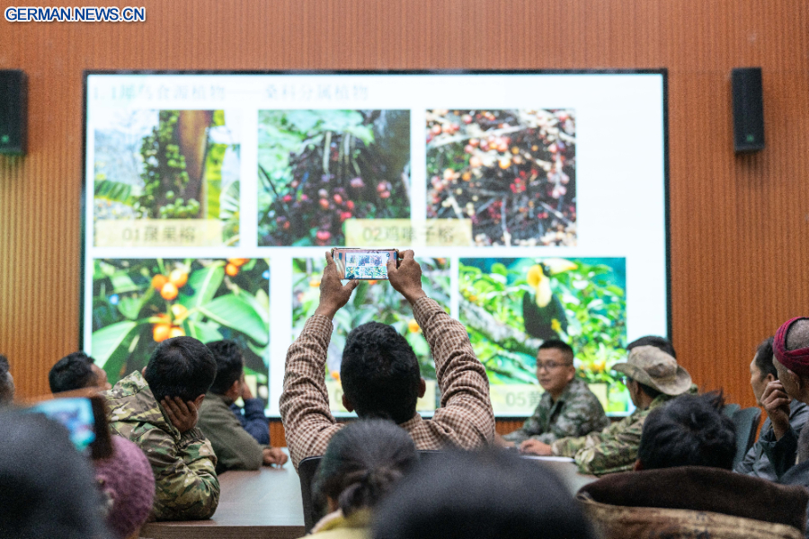 YINGJIANG, 11. Februar 2026 (Xinhua) -- Dorfbewohner lernen Wissenswertes über Nashornvögel im Dorf Shiti im Kreis Yingjiang in der Provinz Yunnan im Südwesten Chinas, 5. Februar 2026. Im Provinz-Naturschutzgebiet Yunnan Tongbiguan befinden sich Nashornvögel, eine in China unter staatlichem Schutz der höchsten Kategorie stehende Art, in einer kritischen Phase der Brutvorbereitung. Mitglieder des „Nashornvogel-Patrouillenteams” führen regelmäßige Patrouillen durch, um die Sicherheit der Vögel während der Brutzeit zu gewährleisten.