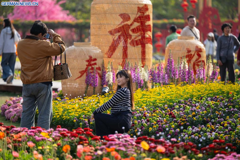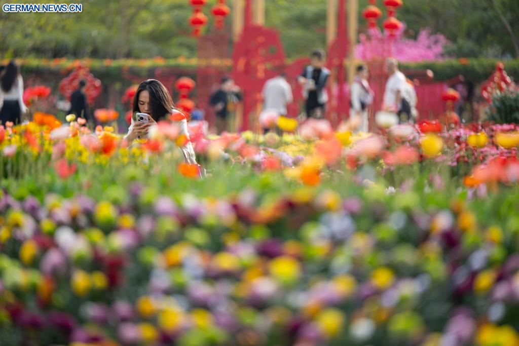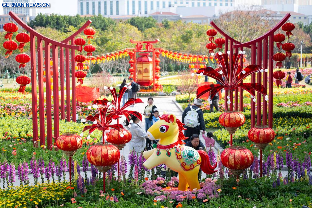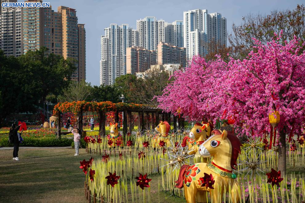 MACAO, 12. Februar 2026 (Xinhuanet) -- Menschen besuchen eine Blumenausstellung im Taipa Houses Museum in Macao in Südchina, 12. Februar 2026. Die Blumenausstellung findet hier zur Feier des bevorstehenden chinesischen Neujahrsfests statt. (Quelle: Xinhua/Cheong Kam Ka)