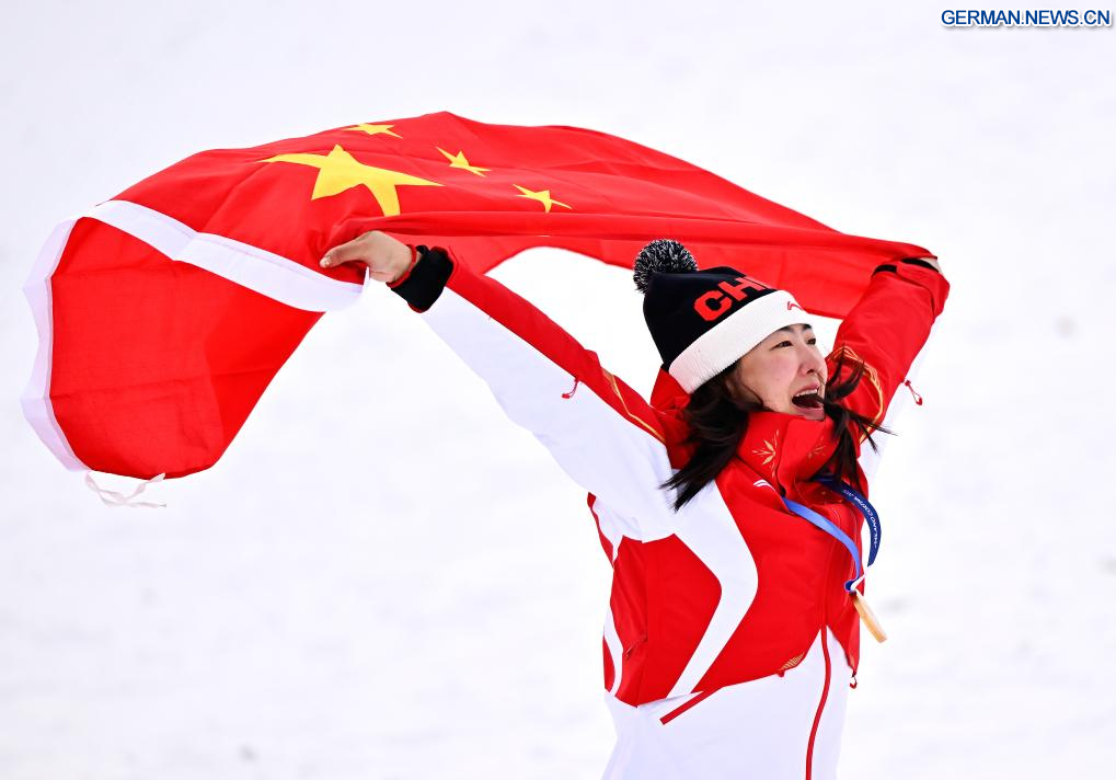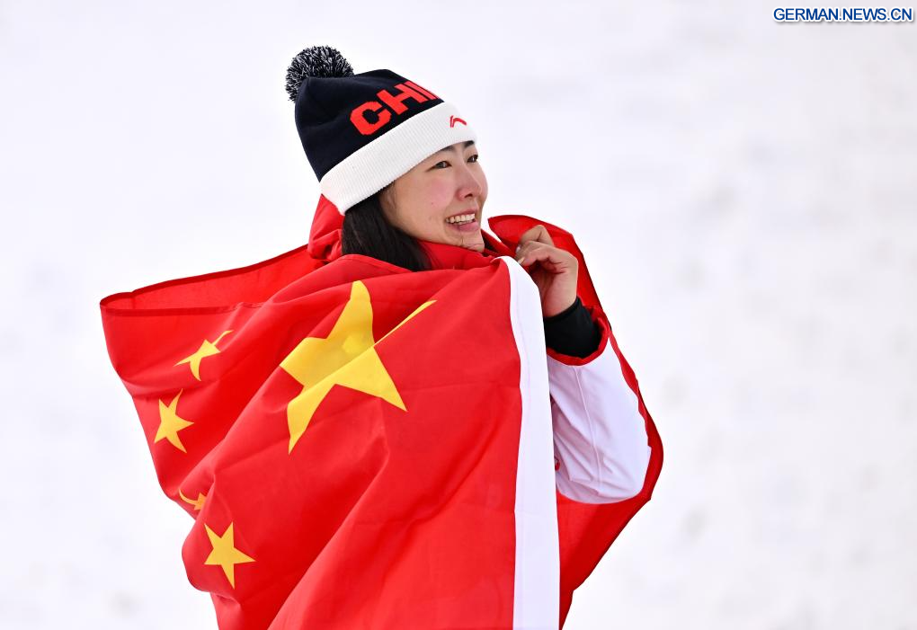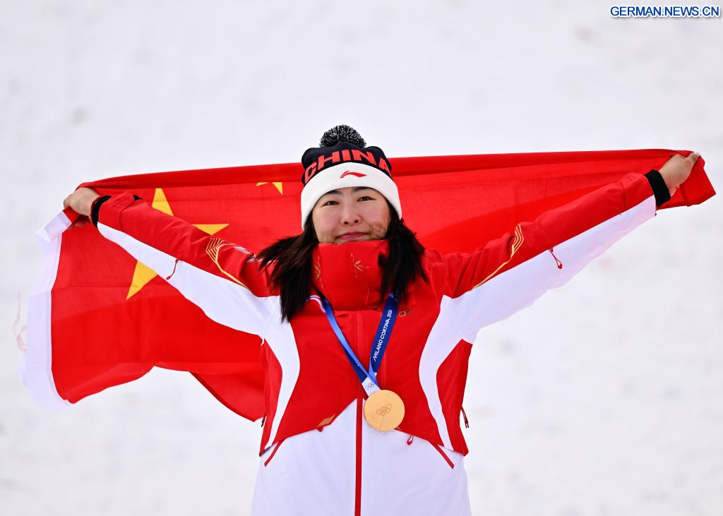 LIVIGNO, 18. Februar 2026 (Xinhuanet) -- Die Goldmedaillengewinnerin Xu Mengtao aus China reagiert während der Siegerehrung für Aerials-Wettbewerb im Freestyle-Skiing der Frauen bei den Olympischen Winterspielen 2026 in Mailand-Cortina in Livigno, Italien, 18. Februar 2026. (Quelle: Xinhua/Zhang Hongxiang)