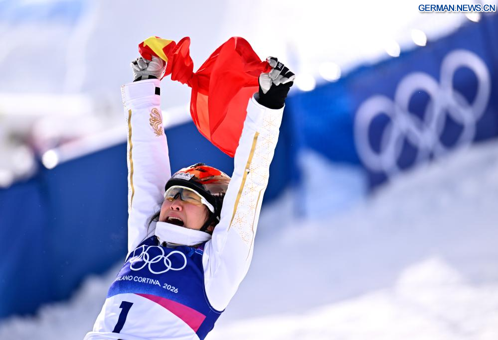 LIVIGNO, 18. Februar 2026 (Xinhuanet) -- Xu Mengtao aus China jubelt nach dem Finale 2 des Aerials-Wettbewerbs im Freestyle-Skiing der Frauen bei den Olympischen Winterspielen 2026 in Mailand-Cortina in Livigno, Italien, 18. Februar 2026. (Quelle: Xinhua/Zhang Hongxiang)