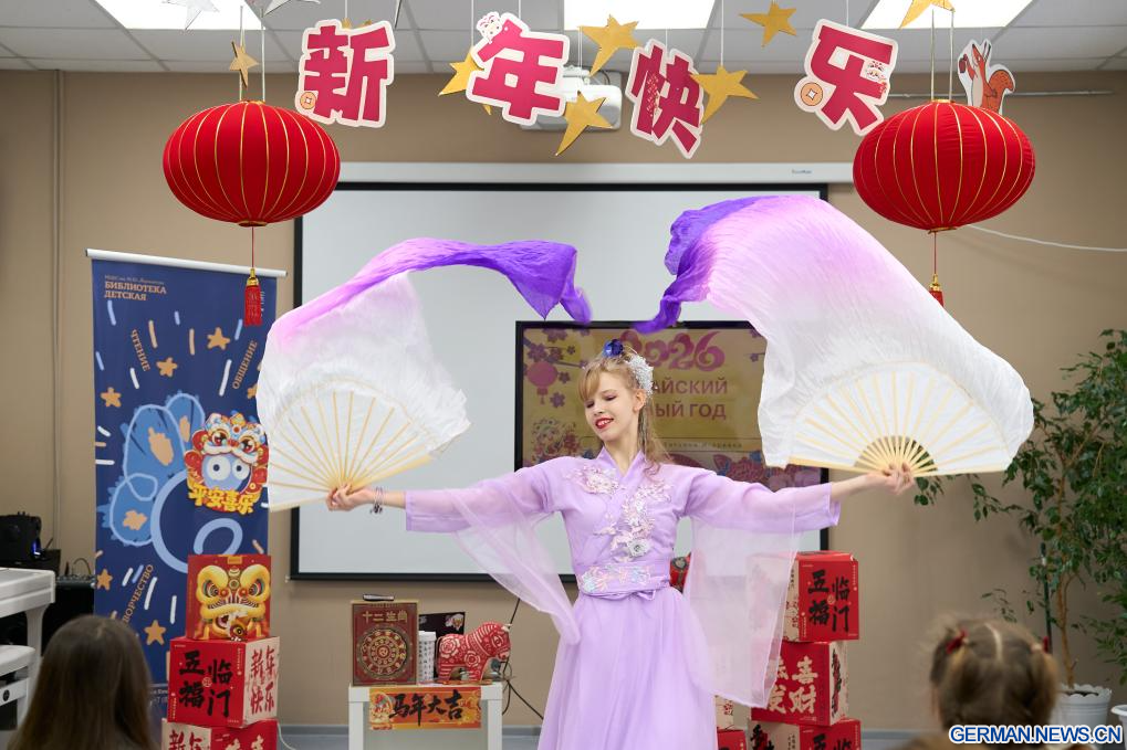 ST. PETERSBURG, 28. Februar 2026 (Xinhuanet) -- Ein Mädchen führt während einer Veranstaltung in einer Bibliothek in St. Petersburg, Russland, einen traditionellen chinesischen Fächertanz auf, 28. Februar 2026. Die Veranstaltung mit dem Titel „Traditionelle chinesische Kultur in der Community“ fand am Samstag statt, wo eine einheimische Sinologin über Kultur und Bräuche im Zusammenhang mit dem chinesischen Frühlingsfest sprach. (Foto von Guo Feizhou /Xinhua)