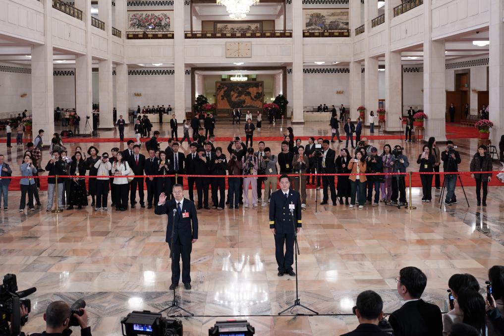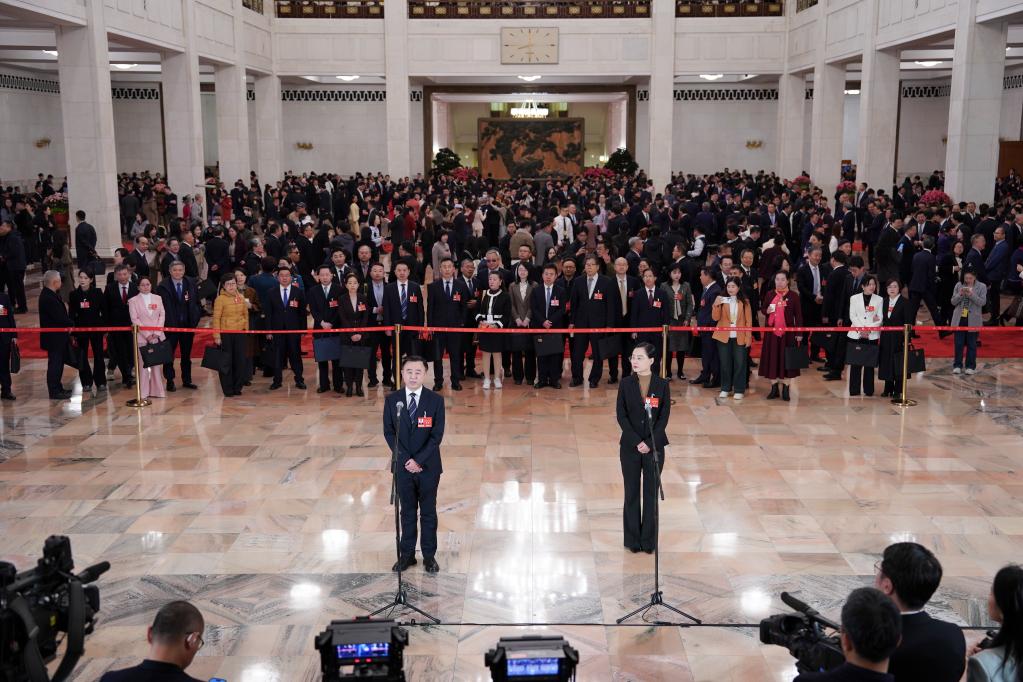 BEIJING, 9. März 2026 (Xinhuanet) -- Abgeordnete des 14. Nationalen Volkskongresses (NVK) nehmen an einem Gruppeninterview vor der zweiten Plenarsitzung der vierten Tagung des 14. NVK in der Großen Halle des Volkes in Chinas Hauptstadt Beijing teil, 9. März 2026. (Quelle: Xinhua/Fu Tian)