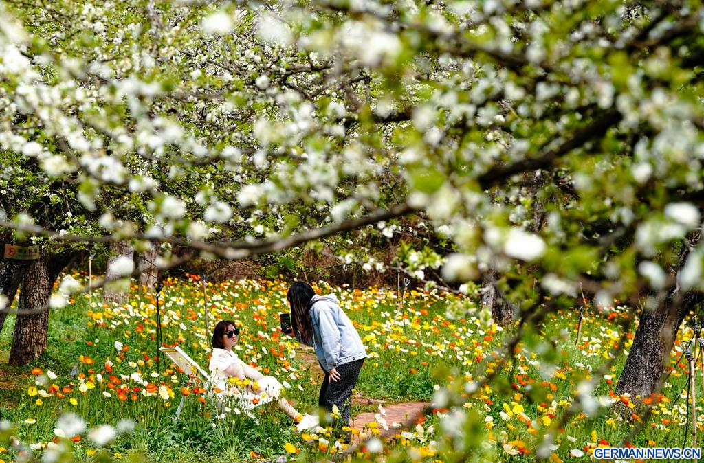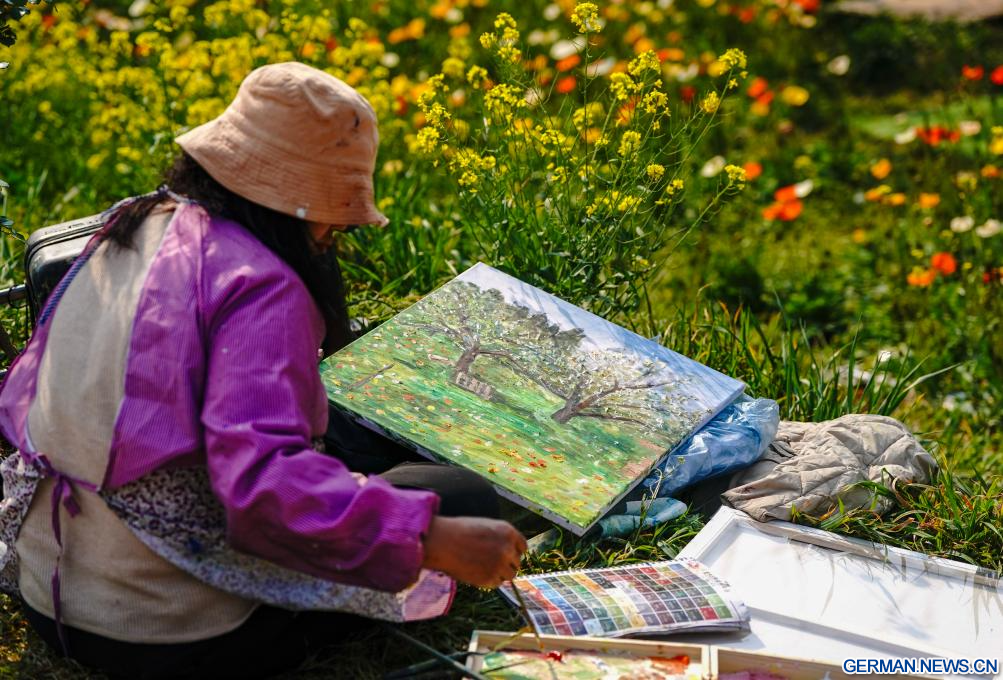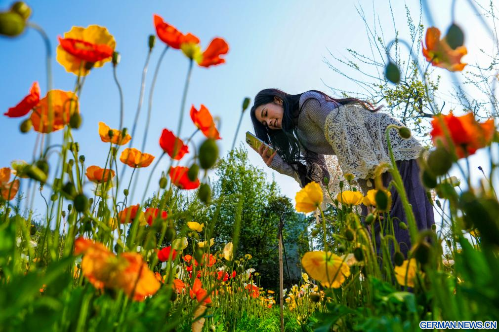 KUNMING, 10. März 2026 (Xinhuanet) -- Eine Besucherin fotografiert Blumen in einem Landschaftsgebiet in Kunming in der südwestchinesischen Provinz Yunnan, 10. März 2026. (Quelle: Xinhua/Chen Xinbo)