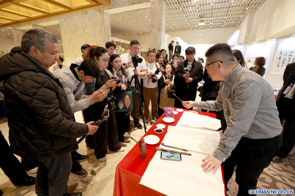BISCHKEK, 11. März 2026 (Xinhuanet) -- Ein chinesischer Maler tauschte sich bei einer Ausstellung über chinesische Malerei zum Thema „Pferd“ in Bischkek, Kirgisistan, mit den Besuchern aus, 10. März 2026. Diese Ausstellung wurde hier am Dienstag eröffnet und präsentiert etwa 50 Werke renommierter chinesischer Maler zum Thema Pferd in verschiedenen Stilen. (Foto von Roman/Xinhua)