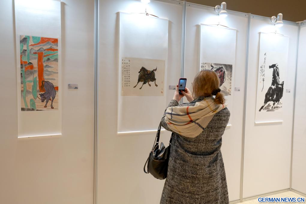 BISCHKEK, 11. März 2026 (Xinhuanet) -- Eine Besucherin fotografiert Exponate bei einer Ausstellung über chinesische Malerei zum Thema „Pferd“ in Bischkek, Kirgisistan, 10. März 2026. Diese Ausstellung wurde hier am Dienstag eröffnet und präsentiert etwa 50 Werke renommierter chinesischer Maler zum Thema Pferd in verschiedenen Stilen. (Foto von Roman/Xinhua)