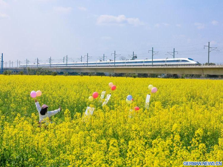 Das Foto zeigt eine Touristin in einem blühenden Rapsfeld vor einem vorbeifahrenden Hochgeschwindigkeitszug im Bezirk Longmatan von Luzhou in der Provinz Sichuan im Südwesten Chinas, 26. Februar 2026. (Foto von Mu Ke/Xinhua)