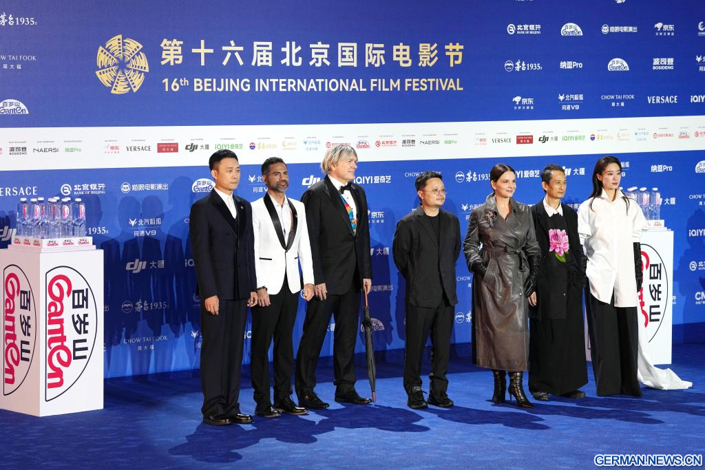 BEIJING, 16. April 2026 (Xinhuanet) -- Juliette Binoche (3. v. r.), Präsidentin der Jury des Tiantan-Preises des 16. Internationalen Filmfestivals von Beijing (BJIFF), posiert für ein Gruppenfoto mit weiteren Jurymitgliedern, darunter Bi Gan (M.), Tran Anh Hung (2. v. r.), Gabriel Mascaro (2. v. l.), Simon Franglen (3. v. l.), Zhang Xiaofei (1. v. r.) und Zhang Yi (1. v. l.), auf dem roten Teppich des 16. BJIFF in der chinesischen Hauptstadt Beijing, 16. April 2026. Das 16. BJIFF wurde am Donnerstag hier im Yanqi Lake International Convention & Exhibition Center eröffnet. (Quelle: Xinhua/Ju Huanzong)