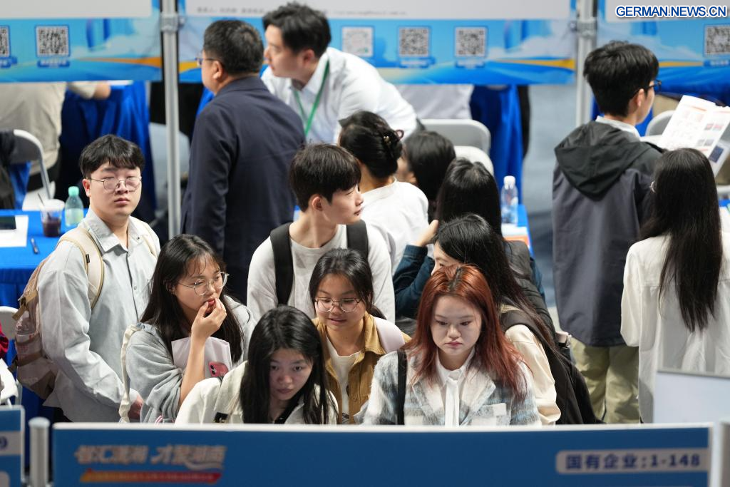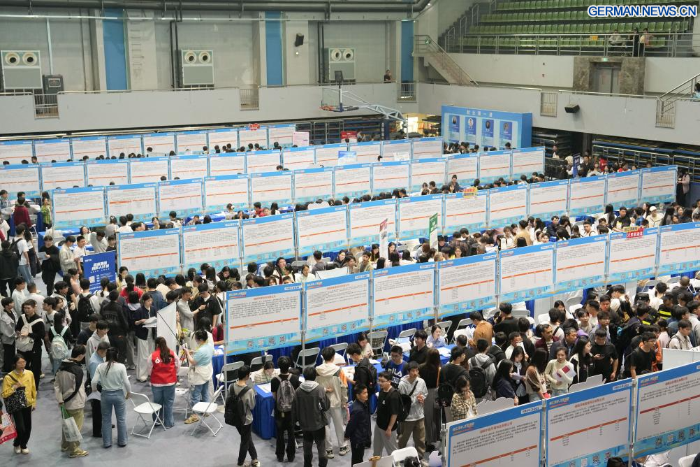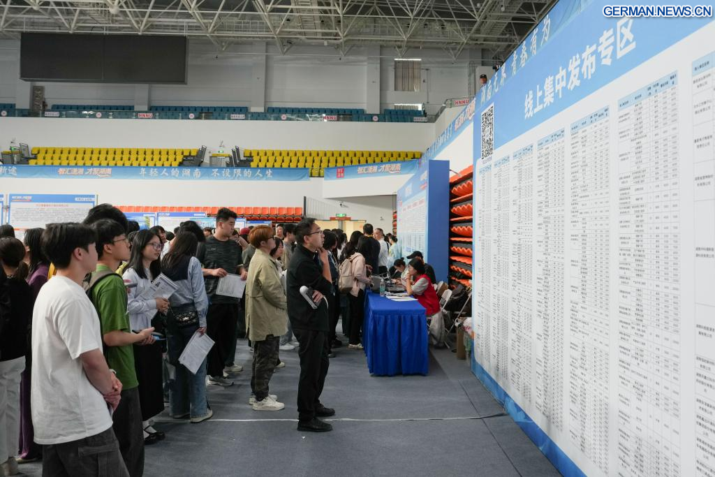 CHANGSHA, 18. April 2026 (Xinhuanet) -- Das Foto vom 18. April 2026 zeigt eine Szene von einer Jobmesse an der Hunan University in Changsha in der zentralchinesischen Provinz Hunan. Die zweitägige Jobmesse für Universitätsabsolventen begann am Samstag, wobei die Hauptveranstaltungsorte die Hunan University und die Hunan Normal University waren. (Quelle: Xinhua/Chen Zhenhai)