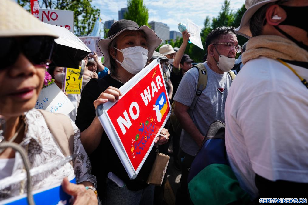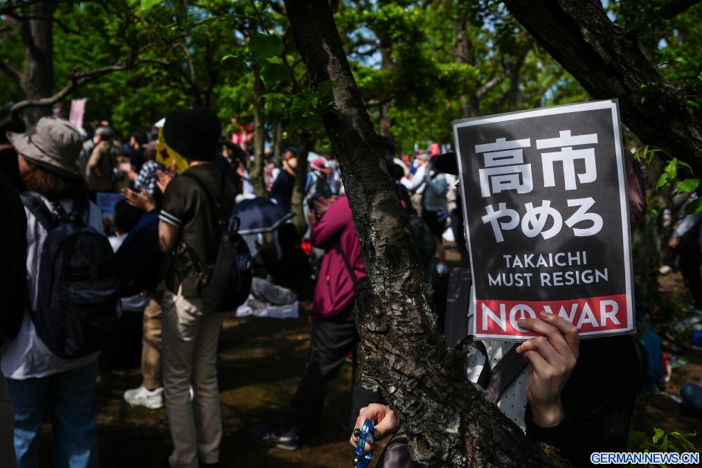TOKIO, 19. April 2026 (Xinhuanet) -- Menschen versammeln sich um das Parlamentsgebäude in Tokio, Japan, um gegen die Versuche der Regierung von Premierministerin Sanae Takaichi zur Änderung der Friedensverfassung des Landes zu protestieren und den Schutz von Artikel 9 zu fordern, 19. April 2026.