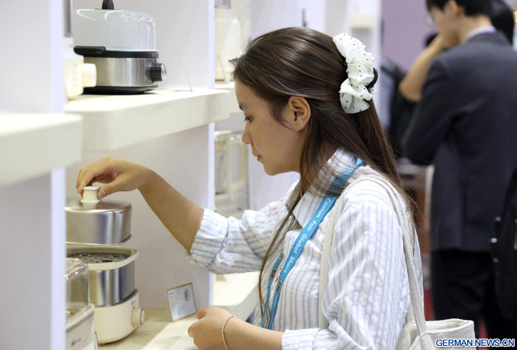 GUANGZHOU, 19. April 2026 (Xinhuanet) -- Eine Käuferin sieht sich kleine Haushaltsgeräte auf der 139. Chinesischen Import- und Exportmesse in Guangzhou in der südchinesischen Provinz Guangdong an, 19. April 2026. Die erste Phase der 139. Chinesischen Import- und Exportmesse, auch bekannt als Kanton-Messe, wurde am Sonntag mit einer Rekordzahl an ausländischen Käufern abgeschlossen, wie die Organisatoren mitteilten. (Quelle: Xinhua/Lu Hanxin)