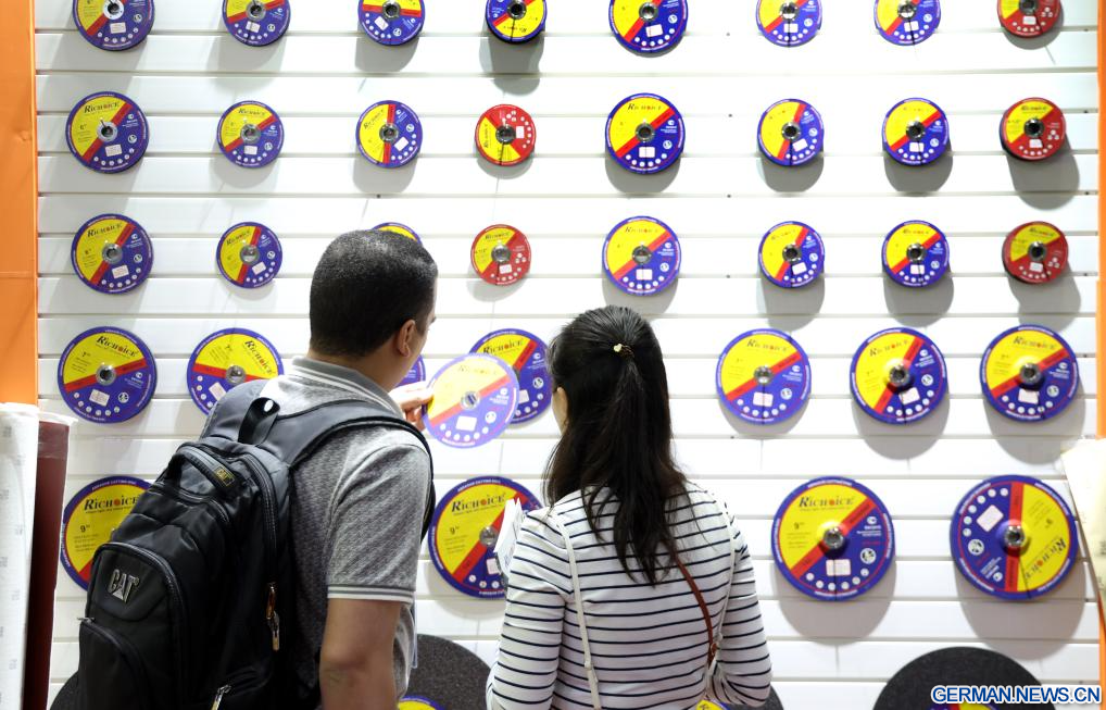 GUANGZHOU, 19. April 2026 (Xinhuanet) -- Käufer begutachten Schleifscheiben auf der 139. Chinesischen Import- und Exportmesse in Guangzhou in der südchinesischen Provinz Guangdong, 19. April 2026. Die erste Phase der 139. Chinesischen Import- und Exportmesse, auch bekannt als Kanton-Messe, wurde am Sonntag mit einer Rekordzahl an ausländischen Käufern abgeschlossen, wie die Organisatoren mitteilten. (Quelle: Xinhua/Lu Hanxin)